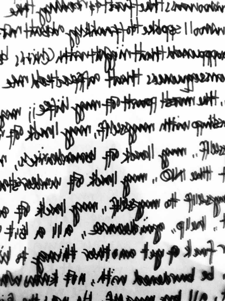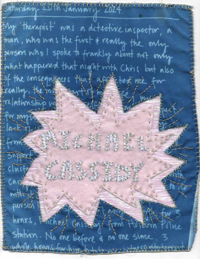 In 2014, with the support of a dear friend, (I couldn’t have done it without her), I finally found the courage to report the crime. I gave my ‘witness statement’ (I found it such a bizarre term, I had never considered myself a ‘witness’), to Detective Inspector Michael Cassidy, who treated me with so much care, consideration and kindness. And it was as I was writing up my notes from my session with my mentor that I felt such a great wave of appreciation for him so drew his name surrounded by a shining star. I later played around with it, photocopying it and combining it with one of my journal entries. I felt compelled to create the artwork as a life size blanket.